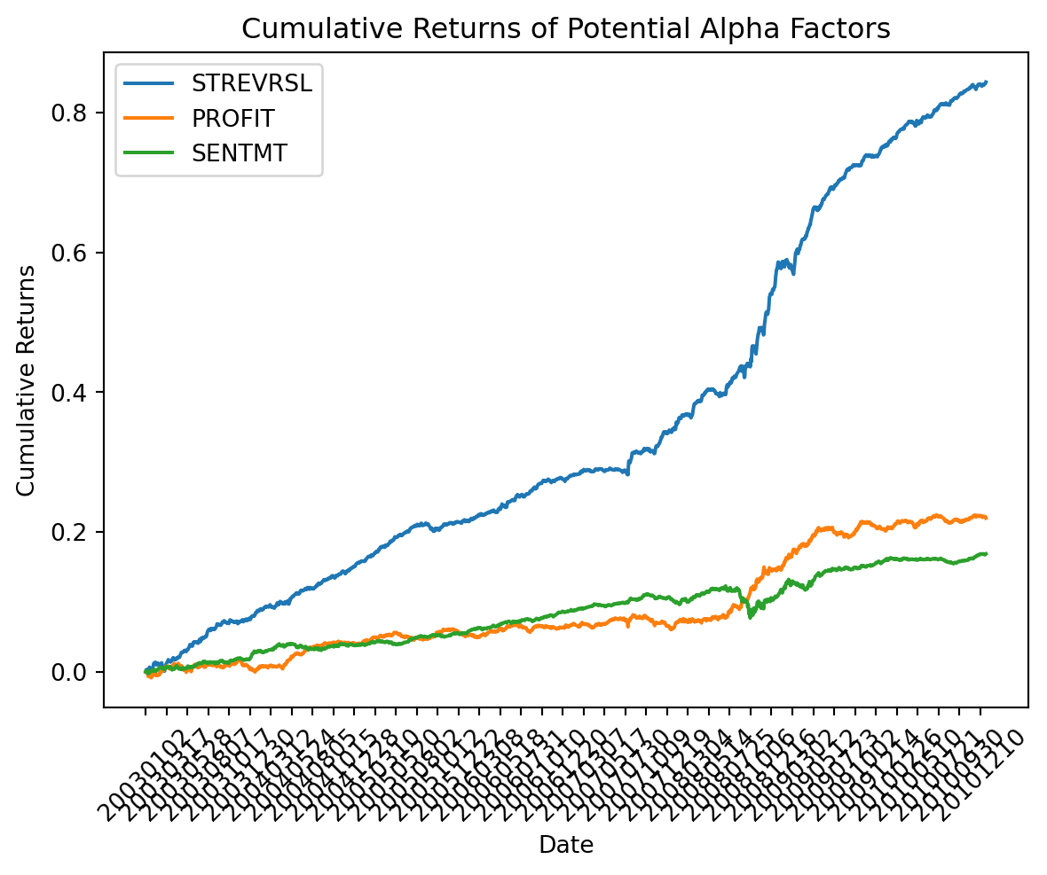For each of the potential alpha factors STREVRSL, PROFIT, SENTMT, run the function created in Problem 2 and plot the cumulative sum of the resulting time series. Do any of these qualify as potential alpha factors? Do the cumulative returns from the plot represent returns on any tradable assets or portfolios?