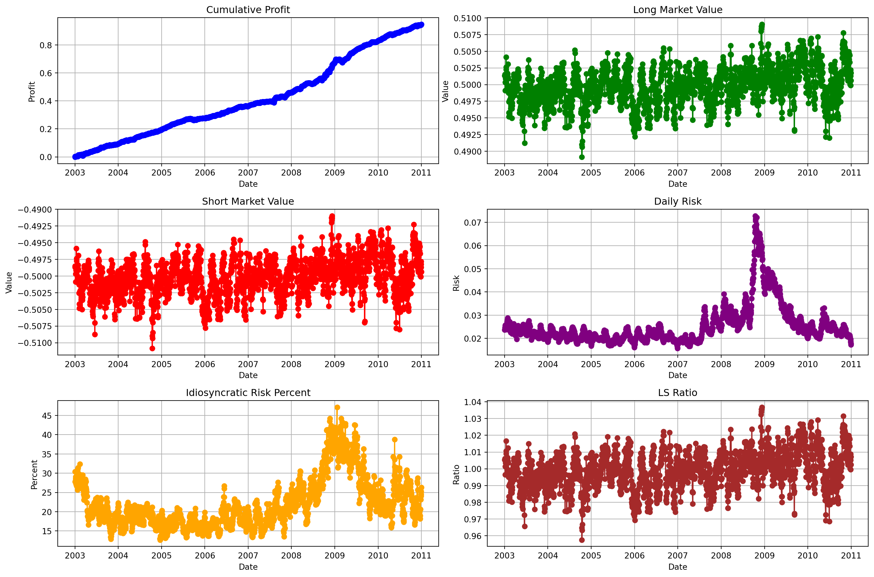 result_df| Cumulative Profit | Long Market Value | Short Market Value | Daily Risk | Idiosyncratic Risk Percent | LS Ratio | |